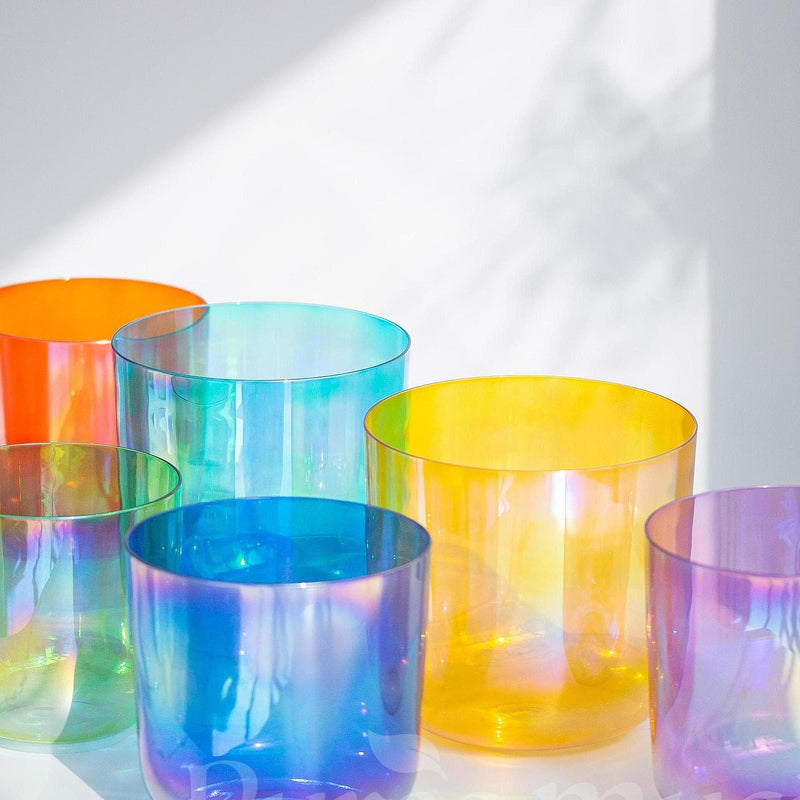 7 個 7 色のアルケミークリアクリスタルシンギングボウルセット。